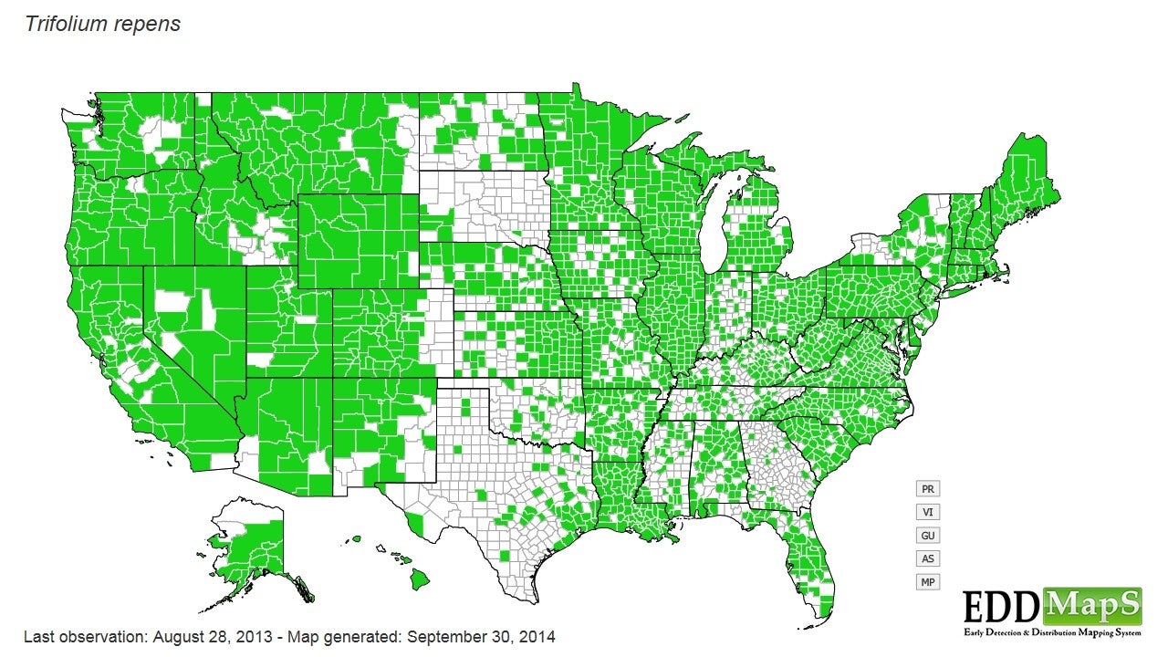 The most famous types of Clover in the world are White clover and Red clover. In the United States, there are at least 300 recognized species of Clover. This diversity includes various types used for forage, landscaping, and other practical purposes. Both White clover and Red clover (and White sweetclover) can be made into tea, but census maps shown below show us where the horses ate too much Clover and died from it. The white flower and purple flower are famous for feeding the bees all across the world and the United States of America.