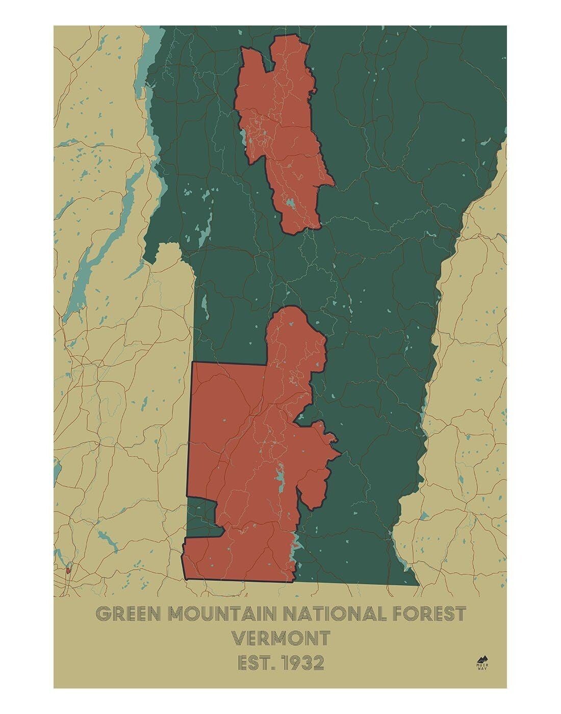 Location map for the Northern Green Mountain National Forest and Southern Green Mountain National Forest, Stratton Mountain in the center of the Southern Green Mountain National Forest, Vermont's state bird the Hermit thrush, and Vermont's state tree, the Sugar maple, the primary source for maple syrup (Acer saccharum).