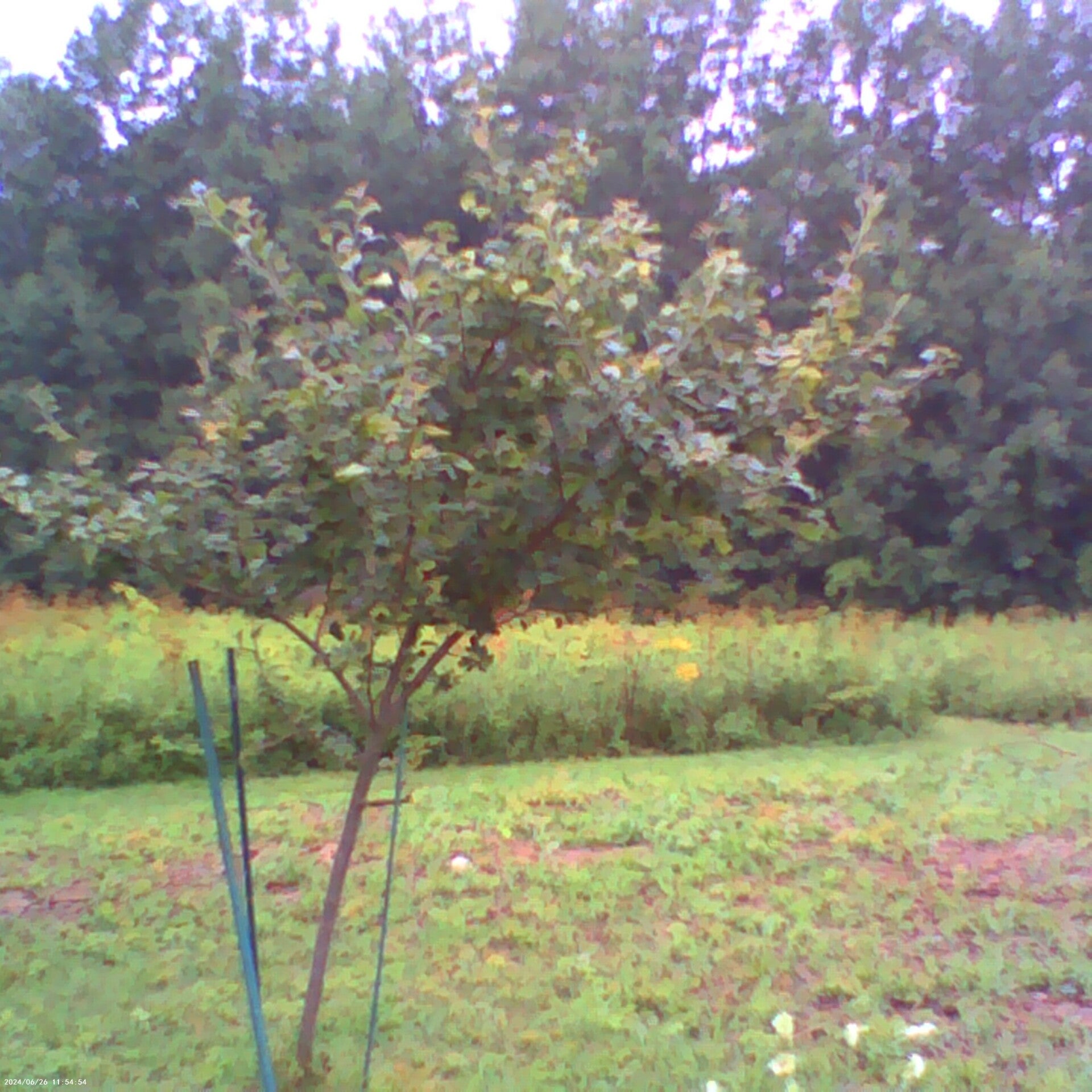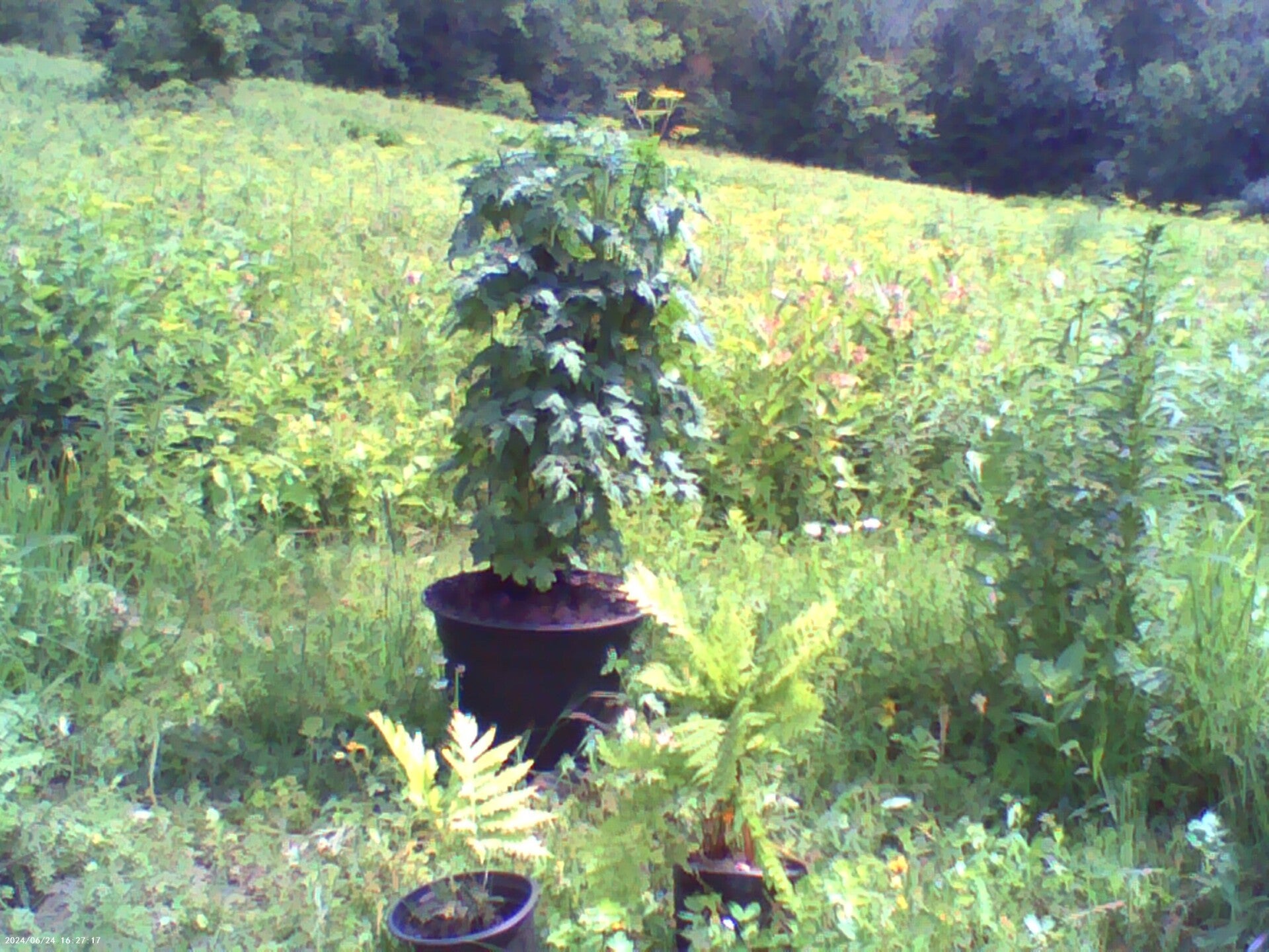 Staghorn sumac bush in the making?... We will have to see. Voted the # 1 Rhus typhina experiment with the most potential from the summer of 2025. Approximately ten teenage sumacs (who needed water and who were upcoming tractor bait), were pulled and up-rooted out of one of our fields and then tied twice very tightly with string around the stems at the bottom of the bunch. The tied sumacs went as fast as possible into a two-foot deep, pre-dug hole. Then we watered the bottom stems quite a bit and flooded and mudslided the deep pit for about five minutes. It took more than an entire cart full of dirt to fill the hole and build up the area around the newly constructed bush so that the teenage sumacs have a chance of standing up against the wind in the field.