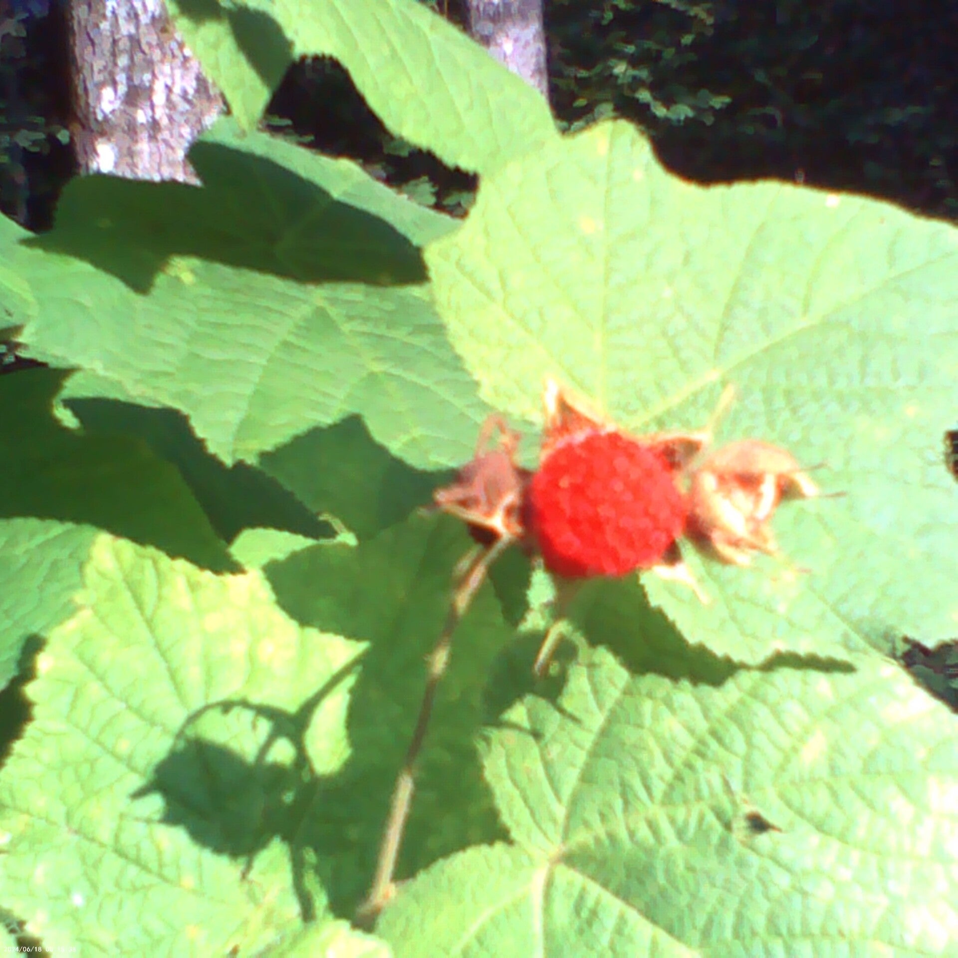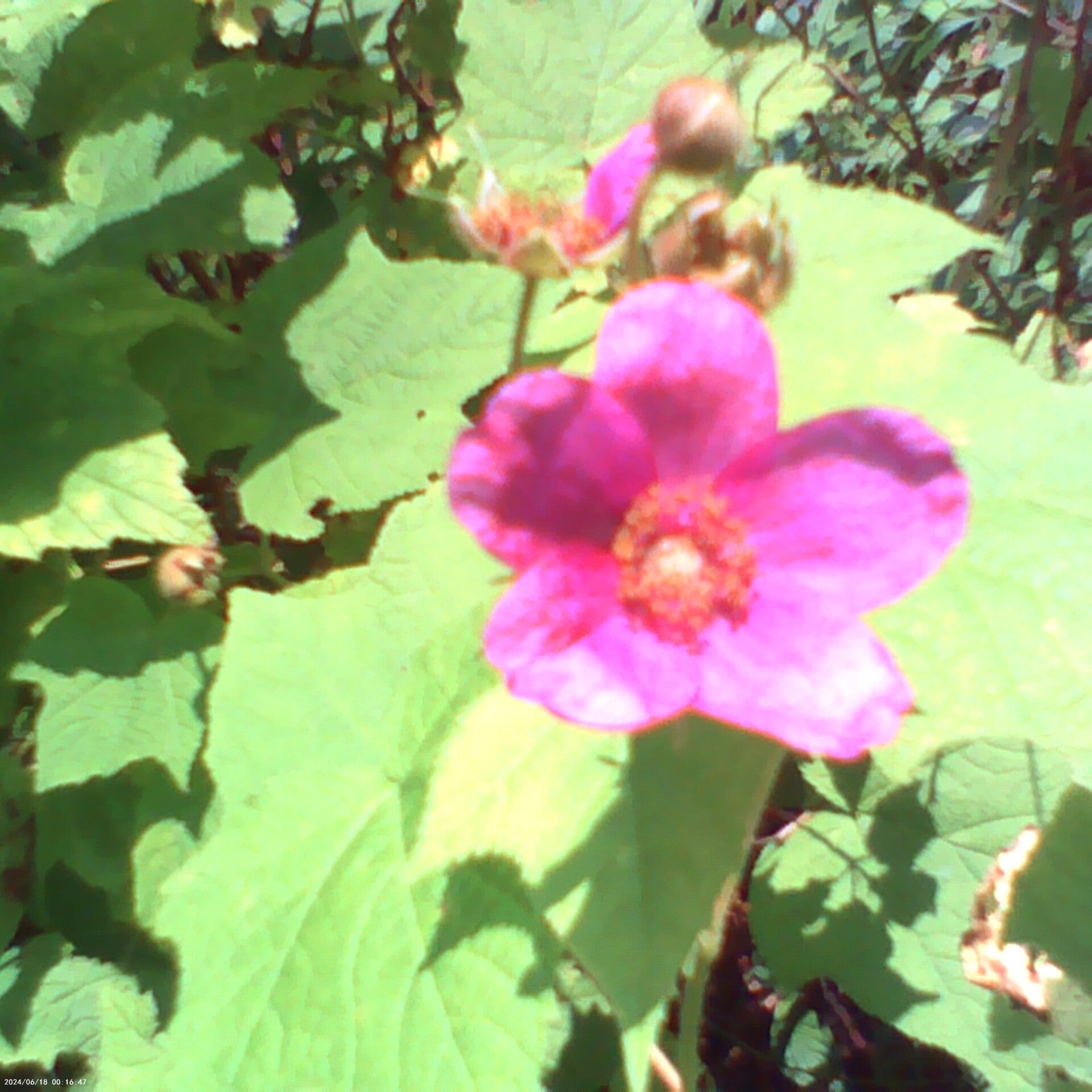 Purple-flowered wild red raspberry bush (edible) also called thimbleberry and its scientific name, Rubus odoratus is native to the Green Mountain National Forest.