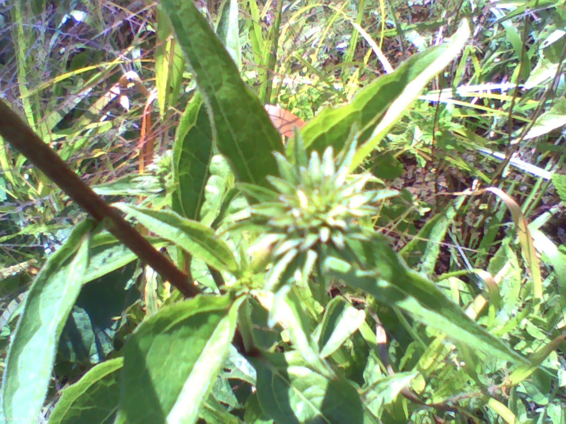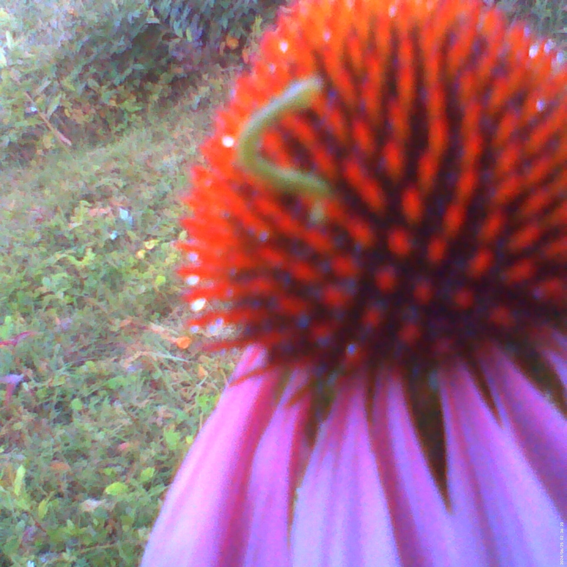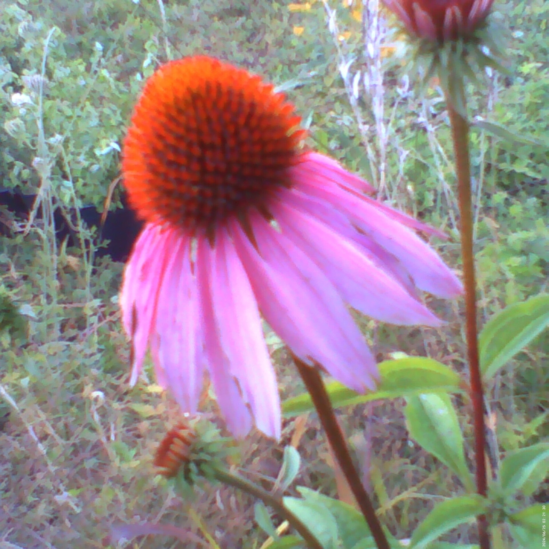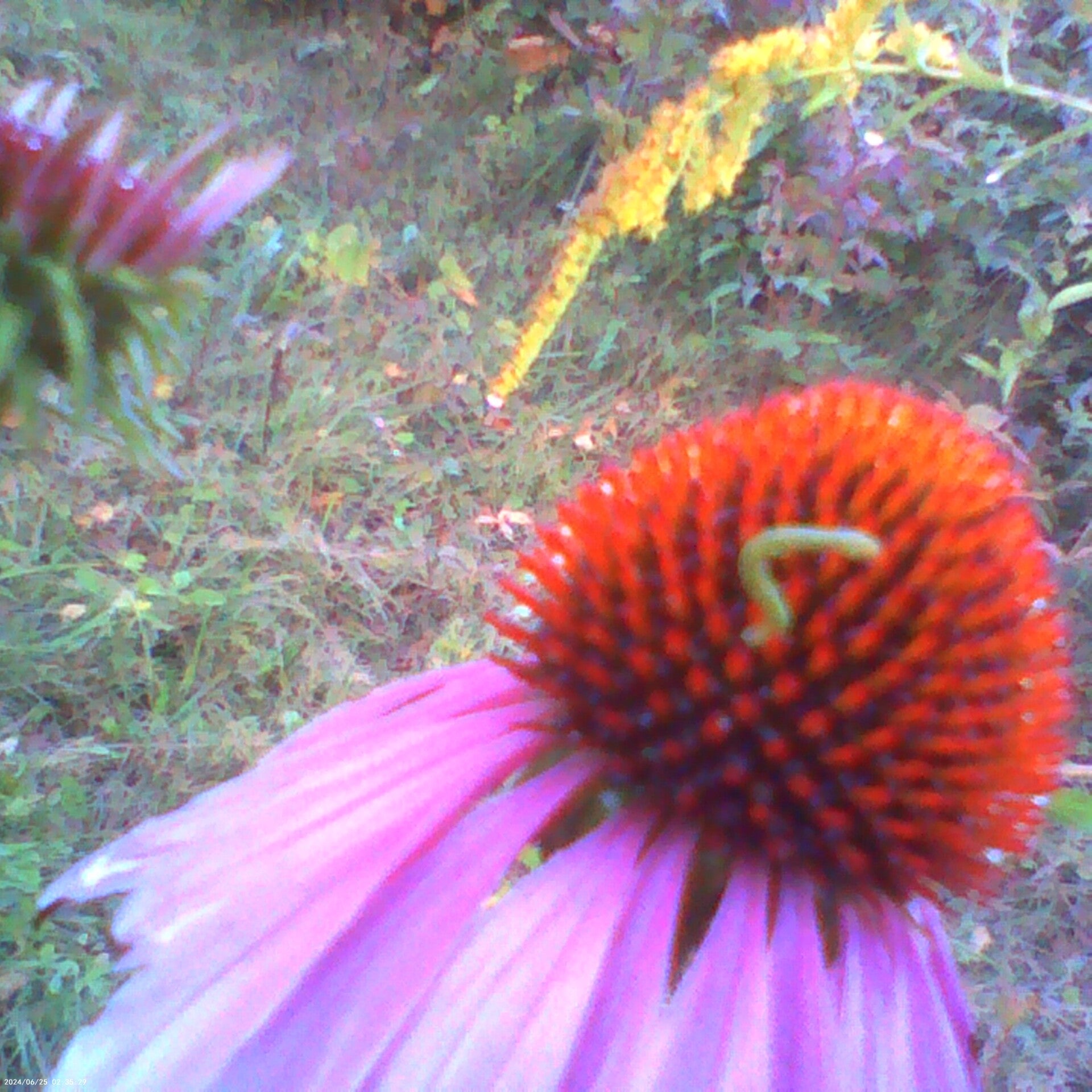 A territorial inch worm protects his Coneflower, we thought it was a piece of grass...