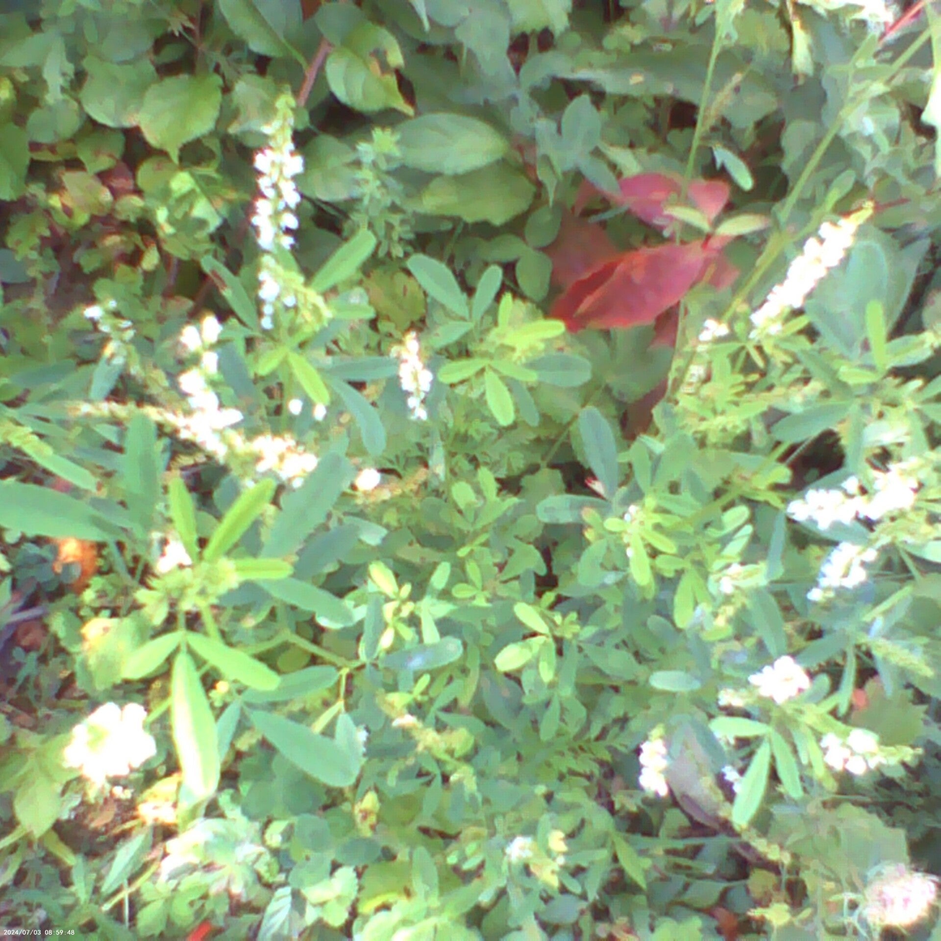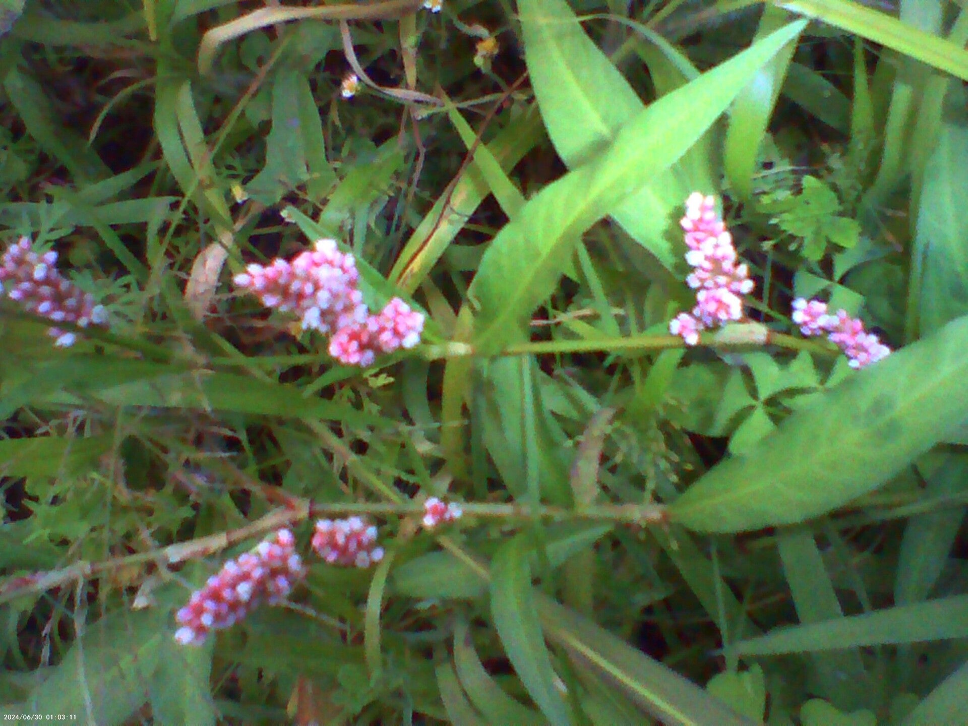 Persicaria longiseta (Oriental lady's thumb), Yellow baby's breath, Persicaria longiseta again, and Red clover (Trifolium pratense) all at Green Mountain Farms.