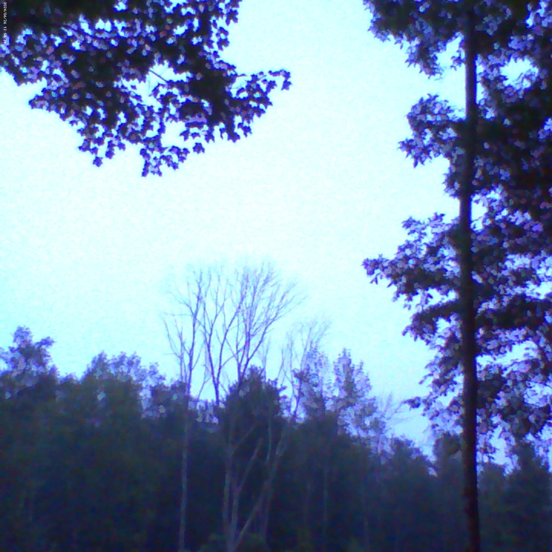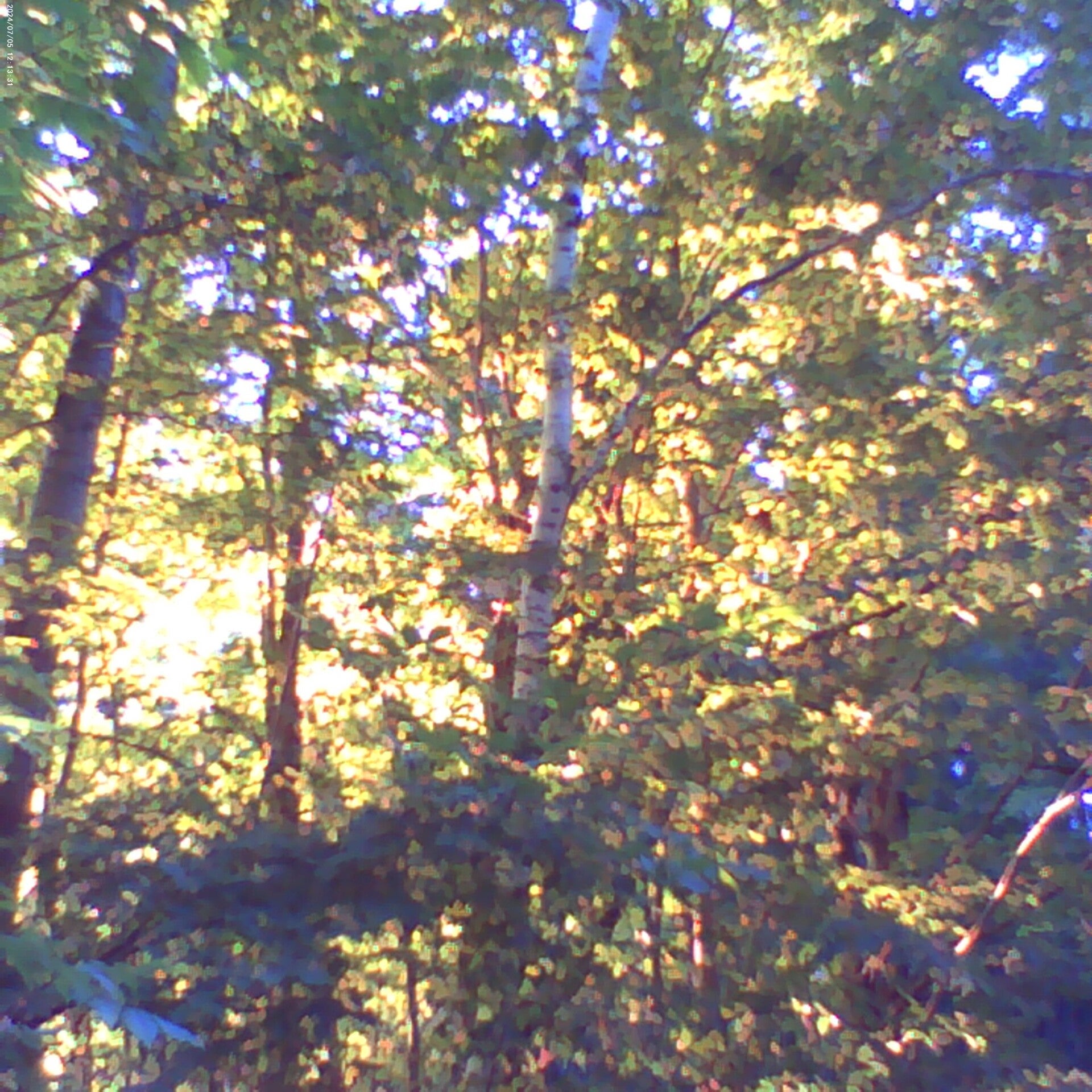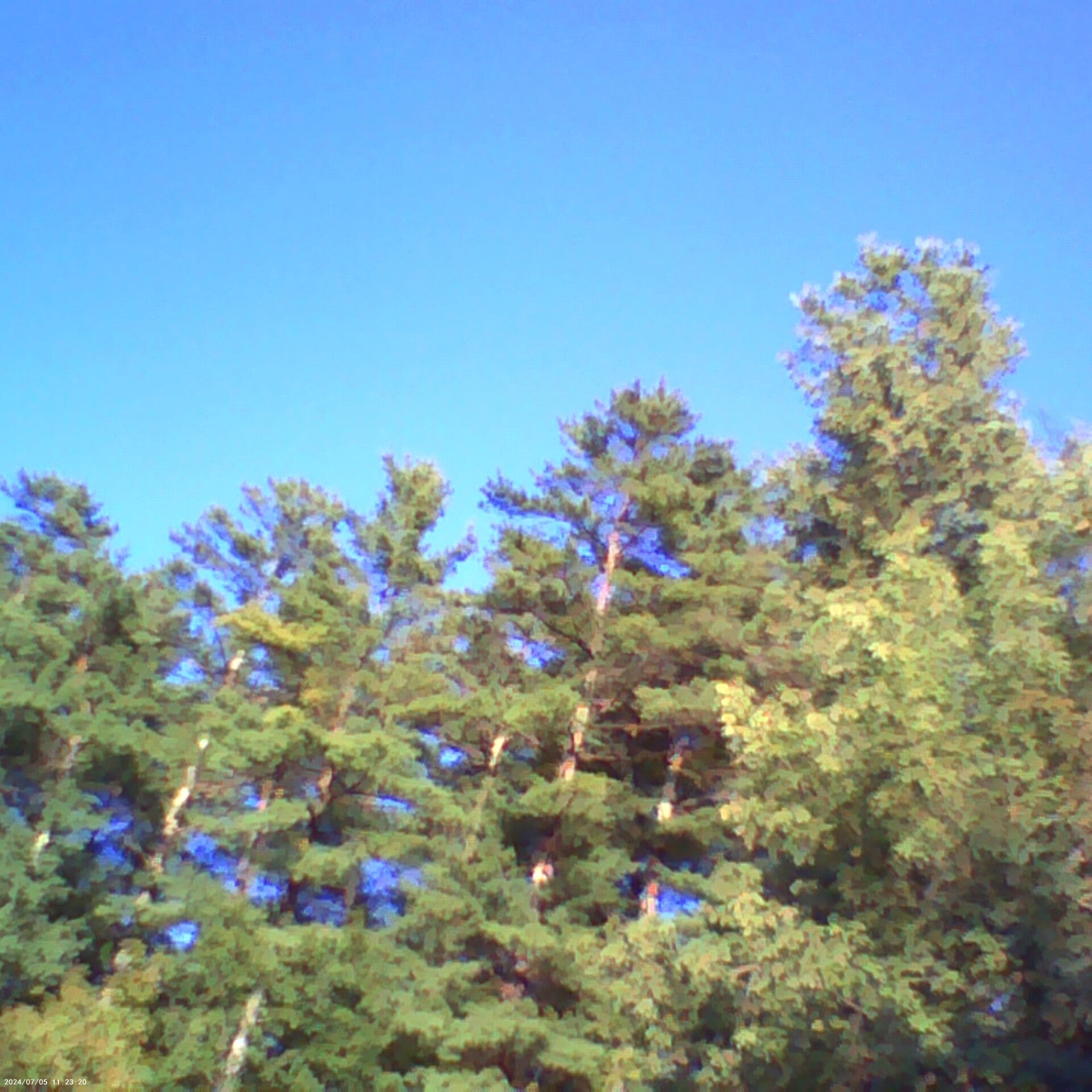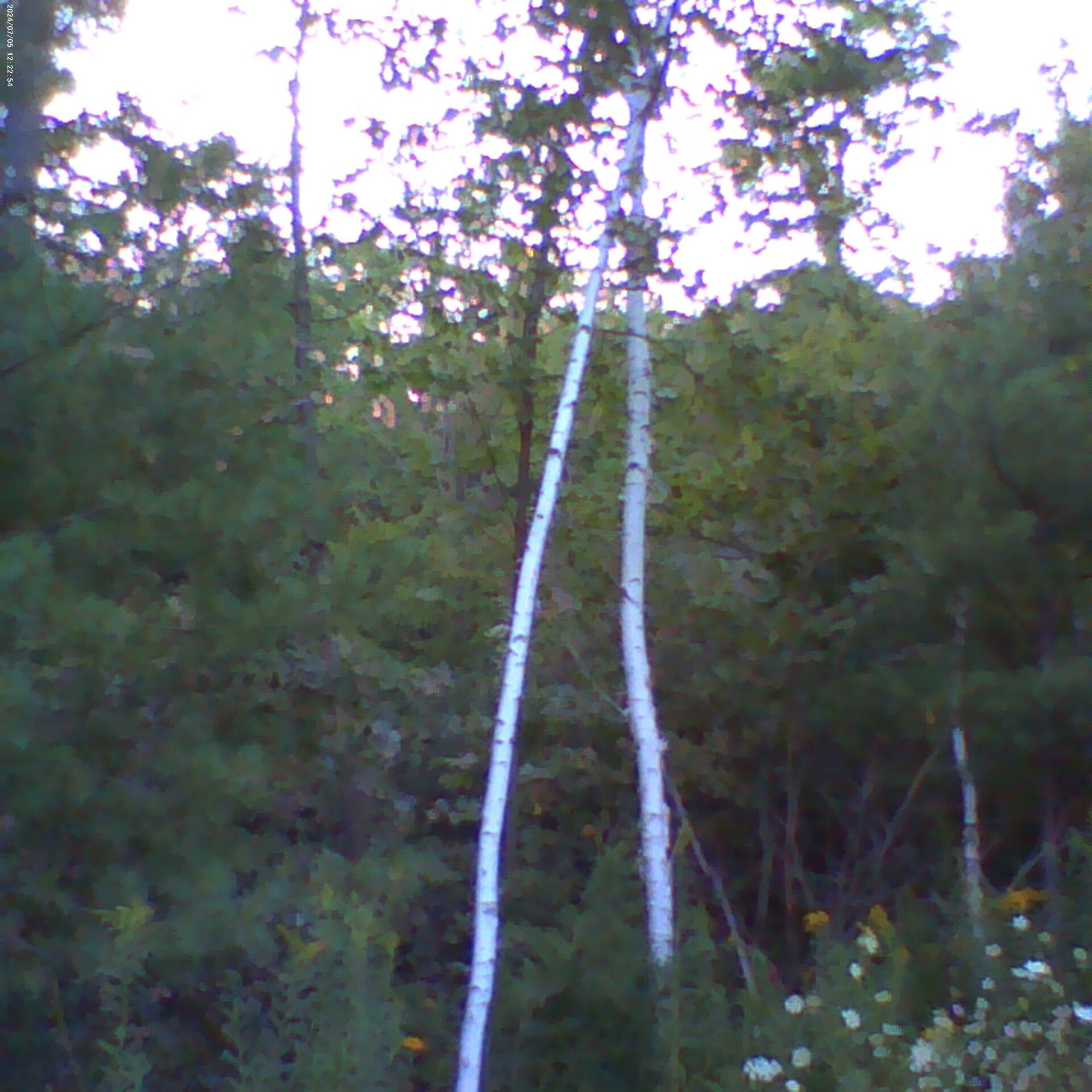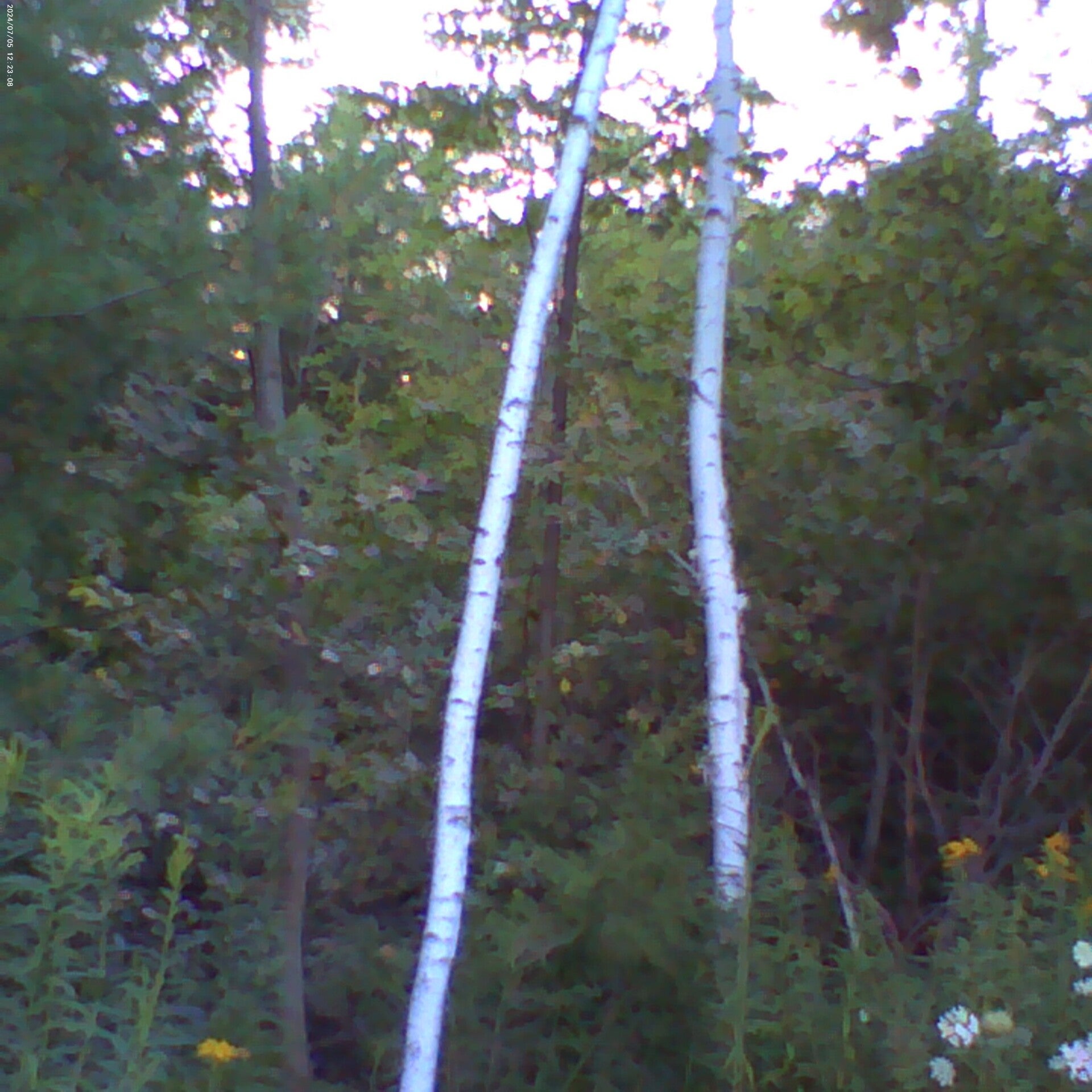 Three White birches (a.k.a. Paper Birch, Scientific name Betula papyrifera) and adult Conifers (a.k.a. Pine trees, Pinophyta).