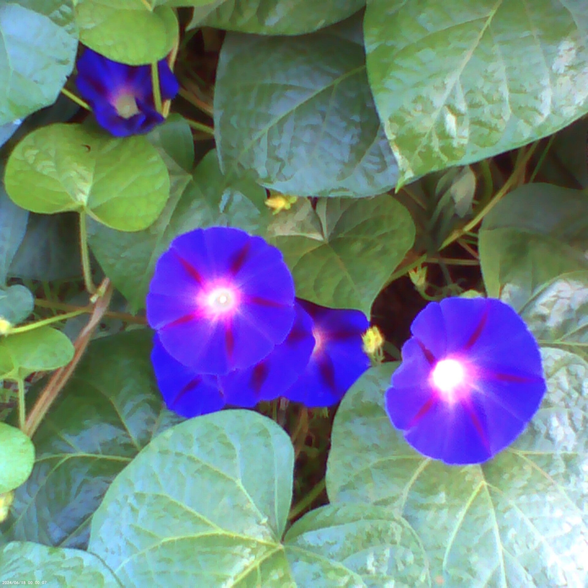 Japanese morning glory flower and vine (Ipomoea nil), the perfect yellow and orange flower of the Delicata winter squash vine and bush (Cucurbita pepo) a white medium to large size winter squash with green stripes, and Hot pink roses (Rosa meldomonac).