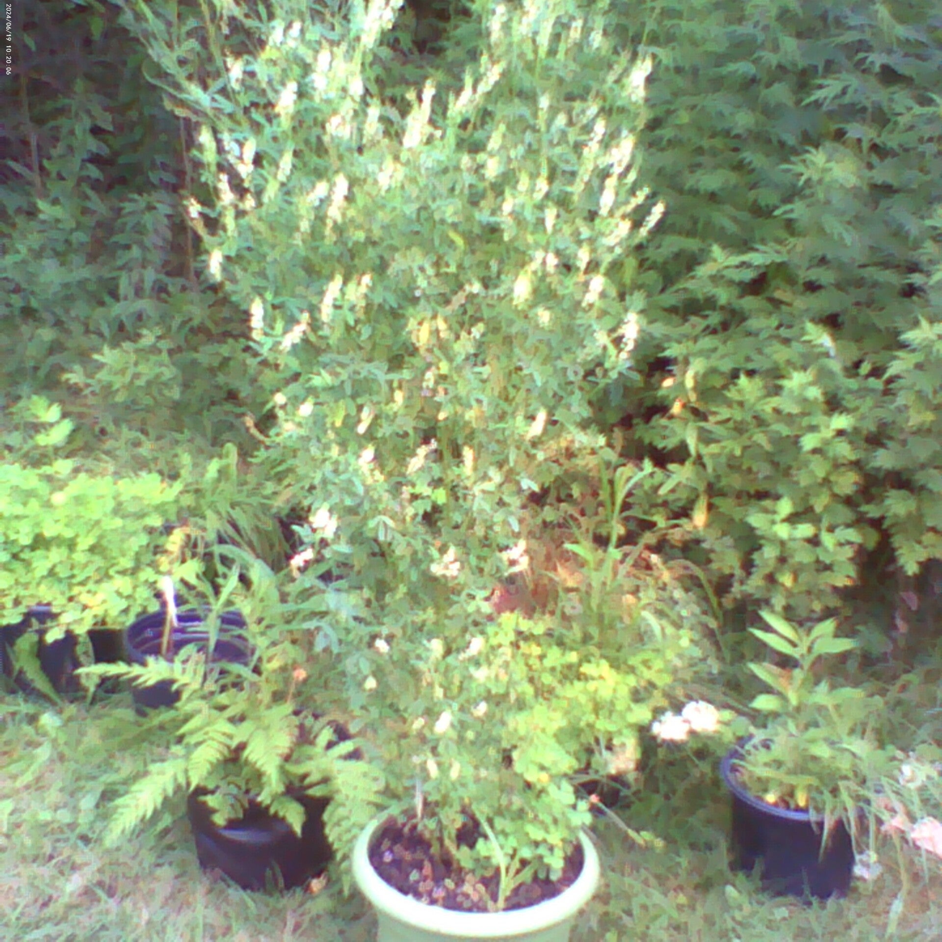 Two Persimmon tomato plants (Diospyros kaki), married in one large 5-gallon pot with two fern friends, Meadowlark Forsythia, and Canada goldenrod (Solidago canadensis) all at Green Mountain Farms.